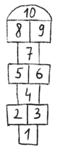 So geht’s: Vom Tempelhüpfen (oder auch „Himmel und Hölle“ genannt) gibt es viele Varianten. Eine davon: Mit einem Stück Straßenkreide werden die Kästchen aufgemalt, wie im Bild. Das erste Kind startet und wirft den Stein in das Feld „1“ und hüpft abwechselnd auf einem Bein weiter. Wo zwei Felder nebeneinander gezeichnet sein, kann mit beiden Beinen gehüpft werden. Das Feld, in welchem der Stein wird, muss übersprungen werden und wird erst auf dem Rückweg eingesammelt. Dann ist das nächste Kind dran und wirft den Stein in das Feld „2“ und so weiter. Bei einem Fehler (Linie berühren, Stein landet im falschen Feld usw.) kommt das nächste Kind dran.